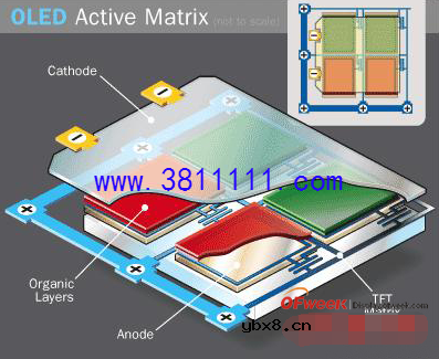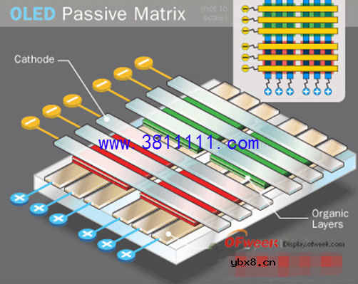 Light-Emitting Diode),OLED的基本结构是由一薄而透明具半导体特性之铟锡氧化物(ITO),与电力之正极相连,再加上另一个金属阴极,包成如三明治的结构。对其输入电压时,正极空穴与阴极电荷就会在发光层中结合,产生光亮,依其配方不同产生红、绿和蓝RGB三原色,构成基本色彩。