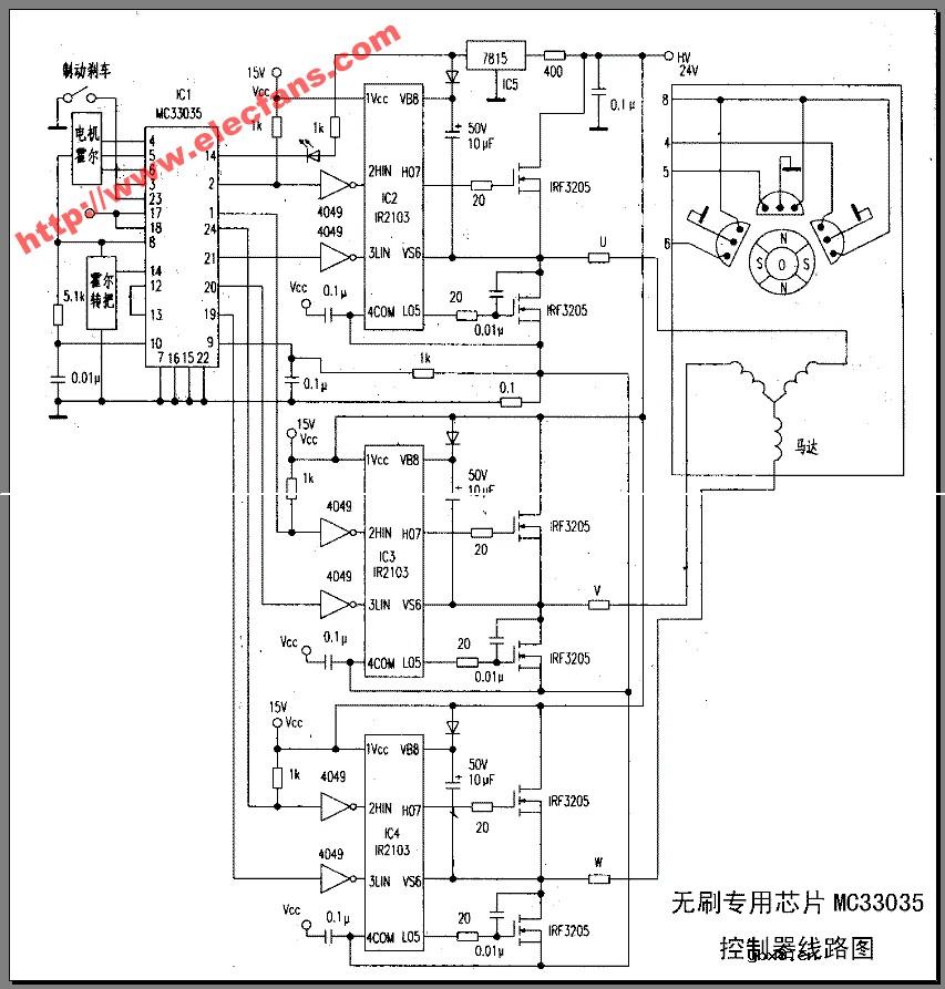 无刷控制器接线图 上图是由无刷专用芯片mc33035中文资料 控制组成的无刷控制器接线图