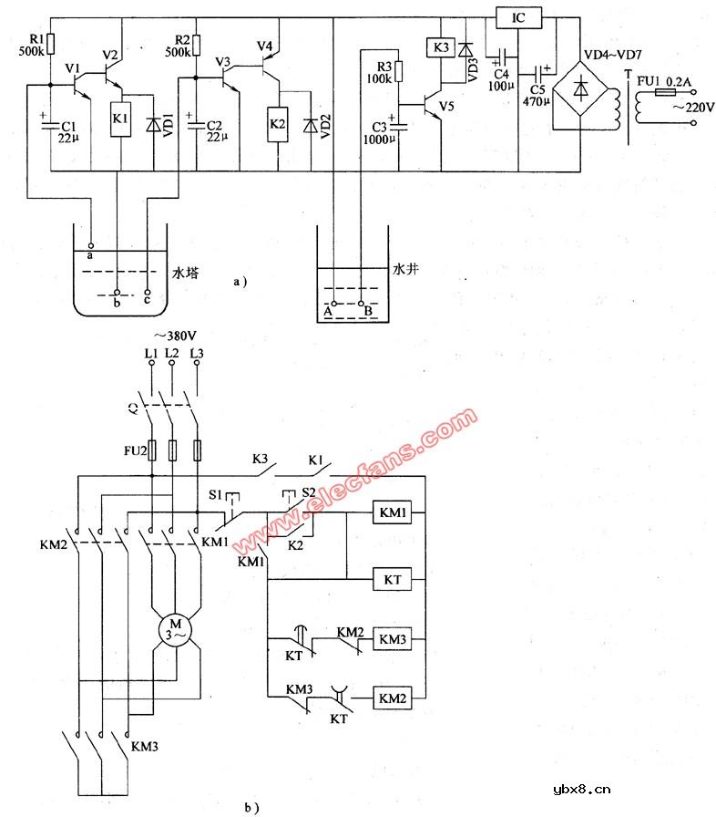 农用自动供水器电路图(6) 本例介绍一款采用分立元件制作的农用自动供水器,可用与农村水塔上水自动控制。在水塔内无水或水位偏低时,它能使水泵运转;在水位达到最高限位时,它能使水泵停止工作,从而使水塔内水位