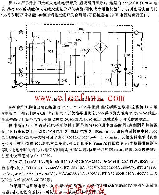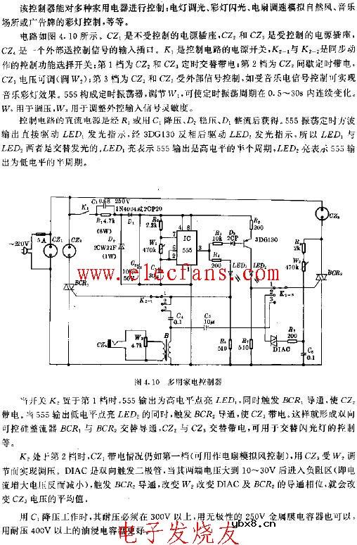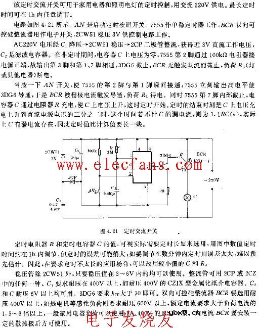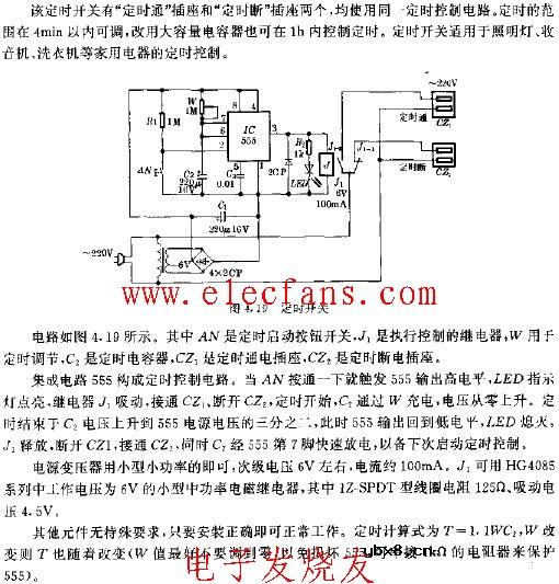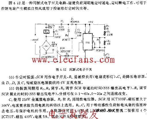 是一种间断式电子开关电路,能使负荷周期地定时通电,定时断电工作,可用于控制电扇模拟自然风或用于控制彩灯定时闪光等。