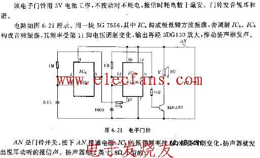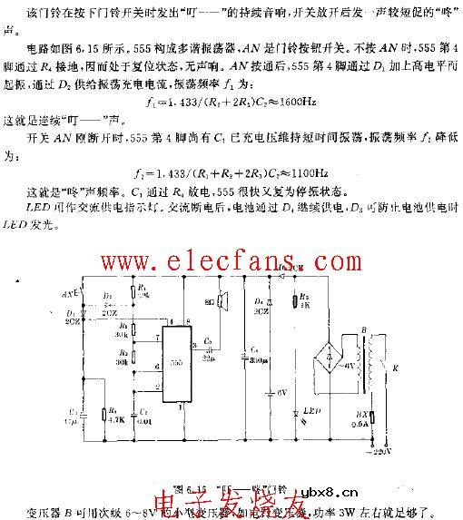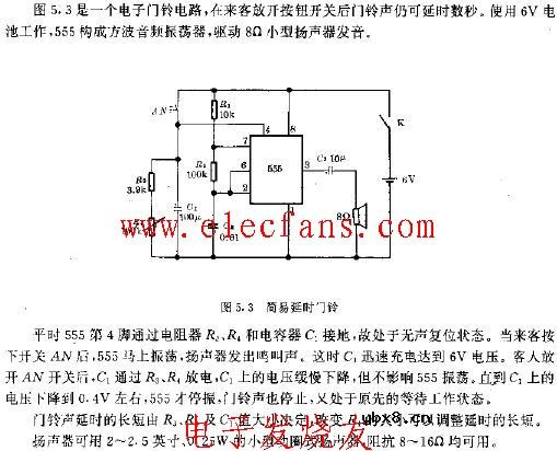 是一个电子门铃电路,在来客放开按钮开关后门铃声仍可延时数秒,使用6V电池工作,555构成方波音频振荡器,驱动8欧小型扬声器发音。