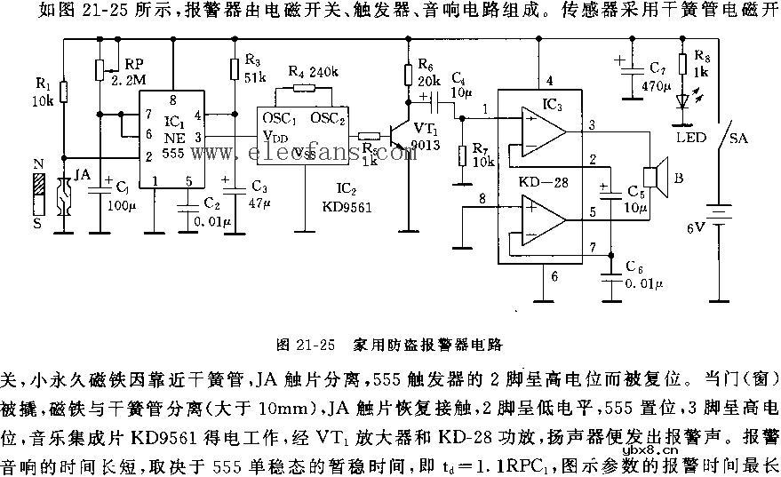 报警器由电磁开关,触发器,音响电路组成。传感器采用干簧管电磁开关,小永久磁铁与干簧管分离。家用防盗报警器电路图的参数的报警时最长约为三分钟。。。