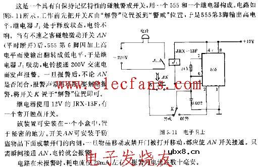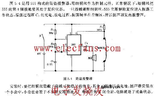 555防盗报警器:是用555构成的防盗报警器,用细铜丝作为控制元件。正常情况下,铜丝把555的第4脚接地使其处理复位状态。