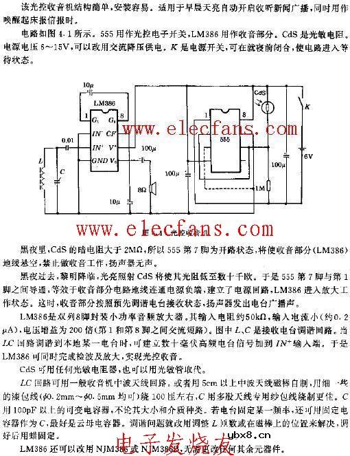 该光控收音机结构简单,安装容易。适用于早晨天亮自动开启收听新闻广播,同时作唤醒起床报信报时。555光控收音机电路图如上图所示。
