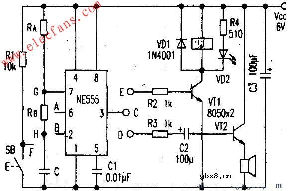 在下图的“555”电路中,改变(6)脚VTH、(2)脚VTR的接线方式。即可完成多谐振荡、单稳定时等功能。 1.(6)、(2)脚相连后接H点。构成多谐振荡电路。振荡频率为f=1.44/(Ra+2Rb)