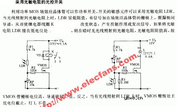 光敏电阻开关电路:利用功率MOS场效应晶体管可以作功率开关,开关的敏感元件可以采用光敏电阻LDR。