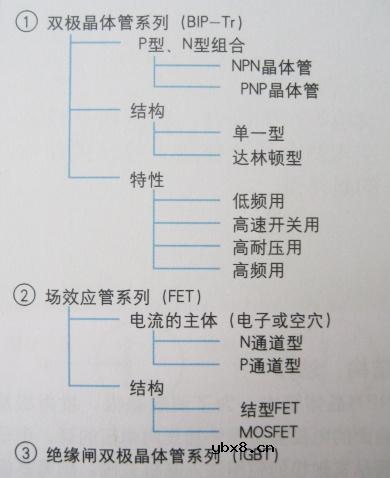 晶体管的种类和使用方法 具有信号放大功能的3个端子的半导体器件。作为电流载体,有利用电子及空穴两个载子的双极晶体管,以及只利用电子或空穴任何一种的场效应管(FET)。