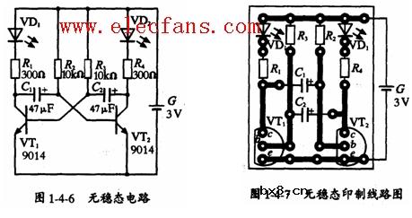 三极管无稳态电路 电源接通时,两个发光二极管一亮一暗,不断交替。也就是说,两个三极管中,一个饱和,另一个截止,而且不断交换。这种电路没有一个稳定的状态,叫做无稳态电路,如图1-4-6所示。无稳态电路的用途