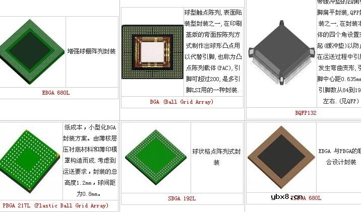 半导体封装类型总汇(封装图示) 点击图片放大 1.BGA 球栅阵列封装 2.CSP 芯片缩放式封装 3.COB 板上芯片贴装 4.COC 瓷质基板上芯片贴装 5.MCM 多芯片模型贴装 6.LCC 无引线片式载体 7.CFP 陶瓷扁平封装 8.P