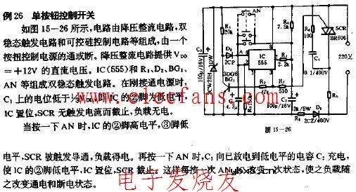 单按钮控制开关:电路由降压整流电路,双稳态触发电路和可控硅控制电路等组成,由一个按扭控制电源的通或断,降压整流电路提供直流电压。