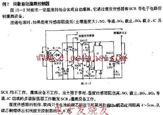 间歇灌控制器电路图:要求一定湿度的场合实现自动灌溉。它通过湿度传感器和SCR等电子电路控制灌溉设备。