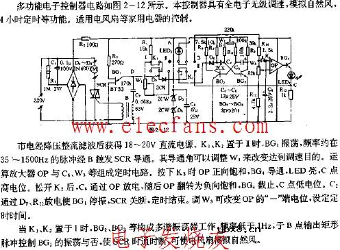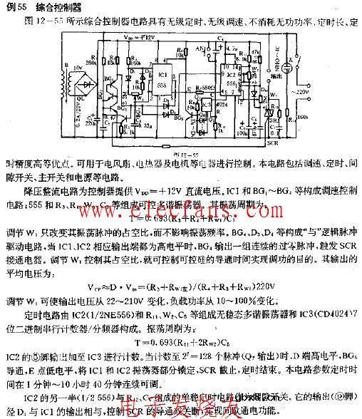 综合控制器:具有无级定时,无级调速,不消耗无功功率,定时长,定时精度高等优点,可用于电风扇 ,电热器及电机等进行控制。