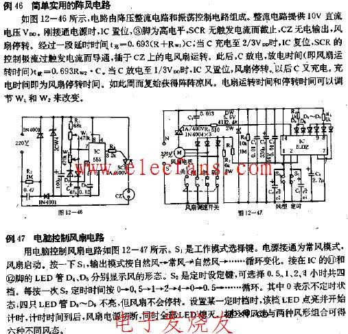 电脑控制风扇电路图:由降压整流电路和振荡控制电路组成,整流电路提供10V直流电压,刚接通电路时,IC置位,。。