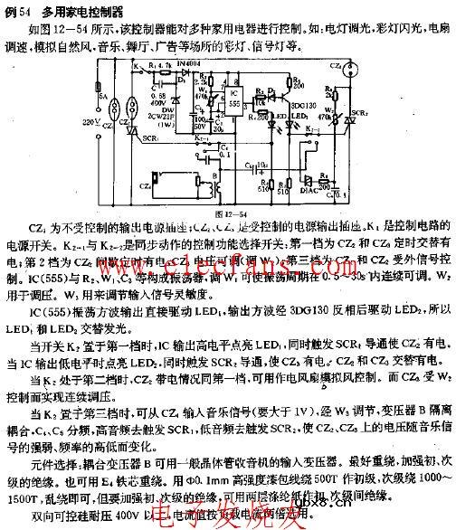 多用家电控制器:该控制器能对多种家用电器进行控制。如,电灯调光,彩灯闪光,电扇调速,模拟自然风,音乐,舞厅等场合的彩灯,信号灯等。
