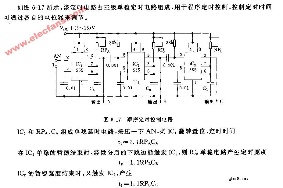 顺序定时控制电路图: 由时基芯片NE555组成.