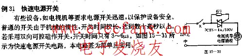 快速电源开关电路图:有些设备,如电视机等要求电源开关迅速,以保护设备安全。普通的开关由于机械的惰性,开关时间较长,达到数十M秒以上。