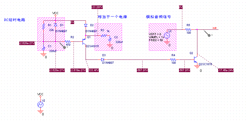 延时开关电路图及详细分析 图1: 相信大家也看明白上图...因为图上都有标明...HE HE...最左边的是RC延时及放电二极管...中间的是为关机而设置的电路,在此大家可以把它看成一个电源...最右边的是模拟音频信号...
