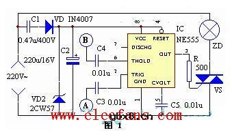 NE555应用电路全集 各种应用电路555触摸定时开关 集成电路IC1是一片555定时电路,在这里接成单稳态电路。平时由于触摸片P端无感应电压,电容C1通过555第7脚放电完毕,第3脚输出为低电平,继电器KS释放,电灯