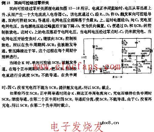 双向可控硅过零开关:双向可控硅过零开关原理图如下。电流正半周起始时,电压从零迅速上升,从而产生一个大电流流入电容器C2,该电流通过C2经R4,D3和D4触发双向可控硅导通。