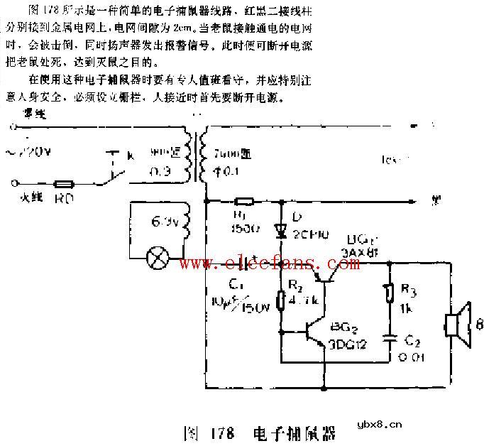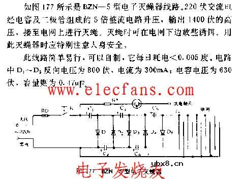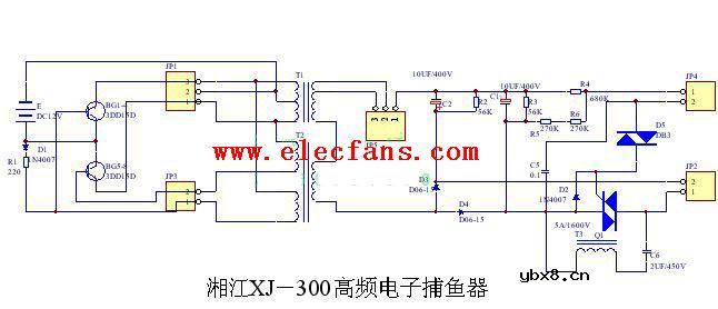 电子捕鱼器电路图 电子捕鱼器电路的工作原理: 本机采用自激振荡方式,晶体管BG1-4,BG5-8和T1,T2,D1和R1组成前级高频自激振荡器。T1次级输出高频高压脉冲经D1,D2,C1,C2组成的倍压整流电路转变为直流高压,