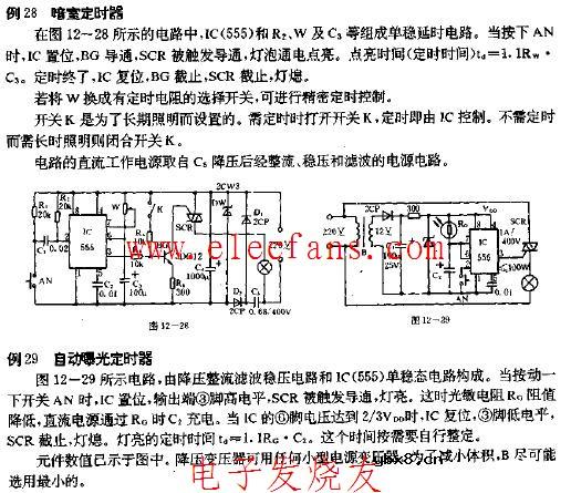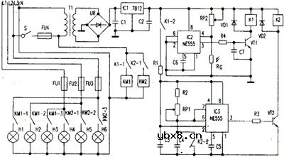 合上电源开关S,220V市电经熔断器FU4至变压器T1初级,次级输出约16V交流加至整流桥UR整流后,经稳压集成块IC1稳压,电容C1、C2滤波为控制电路提供工作电源。IC2、IC3为NE555集成块,IC2与外围元件组成光控电路,IC