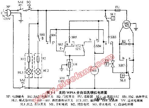 洗碗机电路图 上图为美的WP5B全自动洗碗机电路图,XP为电源插头,SA1,SA2为电源开关,SQ为门控开关,FU为熔断器,HL1为电源指示灯,SB1,SB2选择开关,HL2为模式指示灯,SB3,SB7为程控器程序开关,ED为亮碟剂分配